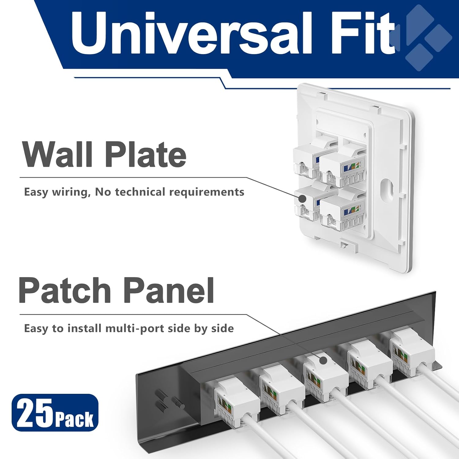 Keystone Jack 25-Pack, RJ45 Cat6 Keystone Jacks, Cat6 Ethernet Jack 90 Degree Punch Down Stand for Patch Panel & Wall Plate, White