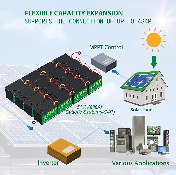 - Expand to Max. 32768wh Energy:With a capacity of 170 Ah and a Max. load power of 2176W, Mjbsan 170Ah Lithium battery caters to the needs of almost all electrical appliances.These batteries can be safely connected in series and in parallel (4S4P) for larger capacity and higher voltage (24V, 36V, 48V), with Max. energy of 34.816kWh and Max. load power of 34.816kW.