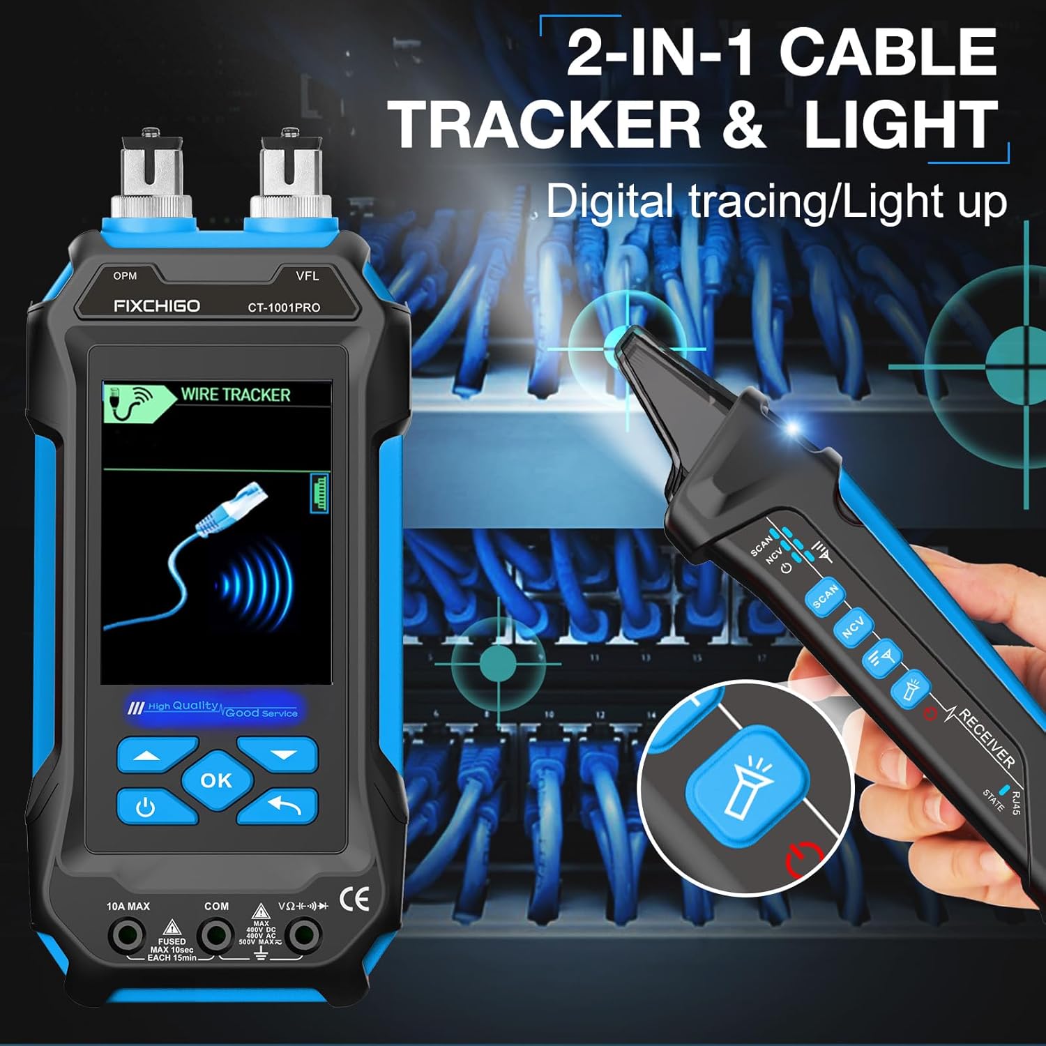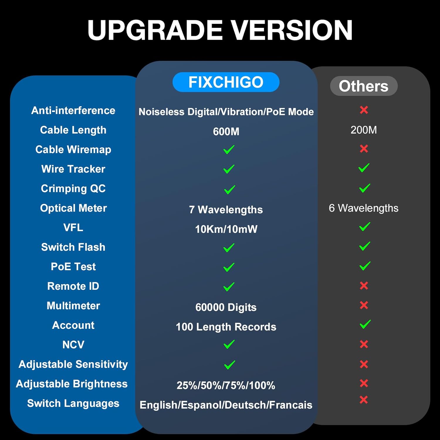 - 11 In 1 FIXCHIGO Network Cable Tester: Feature with cable length, cable wire map, wire tracker, crimping QC, optical meter, VFL, switch flash, PoE test, remote ID, multimeter and account which can meet any of your needs and find and fix it by yourself.