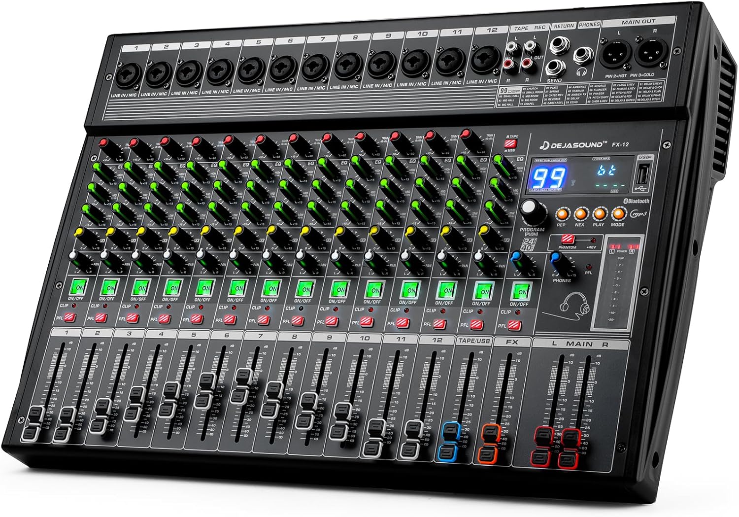 - 【Adaptable to Various Audio Scenarios】The Dejasound FX Series 12-Channel Mixer has comprehensive features, with independent channel switches, making it suitable for various audio scenarios. Whether it's for recording, conferences, or large concerts, you can efficiently manage audio output through the mixer and enjoy a professional mixing control experience