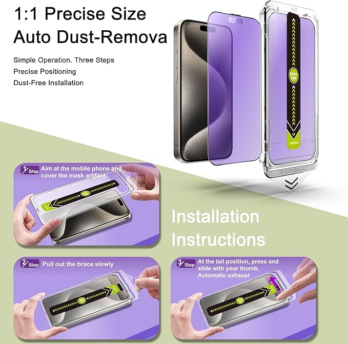 - Auto Dust Removal & Easy Installation: The SY SHANGYAN Anti Blue Light Matte Screen Protector for iPhone 15 Pro Max features advanced auto dust removal and self-aligning technology for a flawless,bubble-free install every time.Just place the frame,pull the tab,and press to push out any air bubbles.Installation is quick,easy,and hassle-free.For best results,watch our step-by-step installation video before applying