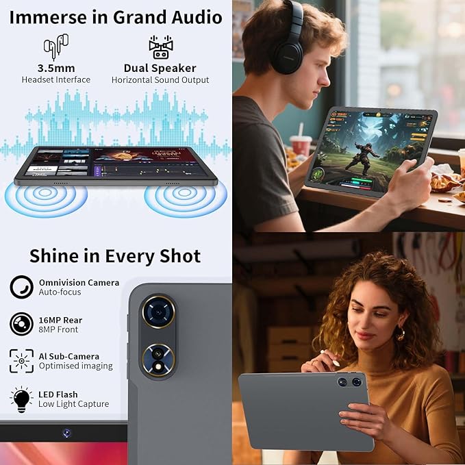 - 【8000mAh + AI Camera 16MP / 8MP】Tablet has a built-in 8000mAh battery with upgraded battery life to provide you with longer usage time. Equipped with USB Type-C + separate 3.5mm headphone jack to meet various needs. 8MP front camera and 16MP rear camera can meet the needs of daily photography and video calls.