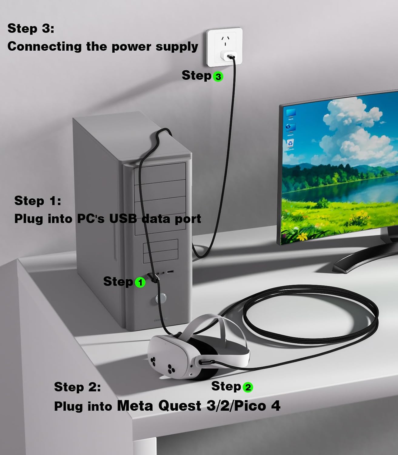 - ăPerfect AdaptationăSupport Meta Quest 3S/Meta Quest 3/Meta Quest 2/Meta Quest Pro/Pico 4 and other mainstream VR devices, plug-and-play perfect support for PC VR streaming and mobile headsets, compatible with SteamVR platform.
