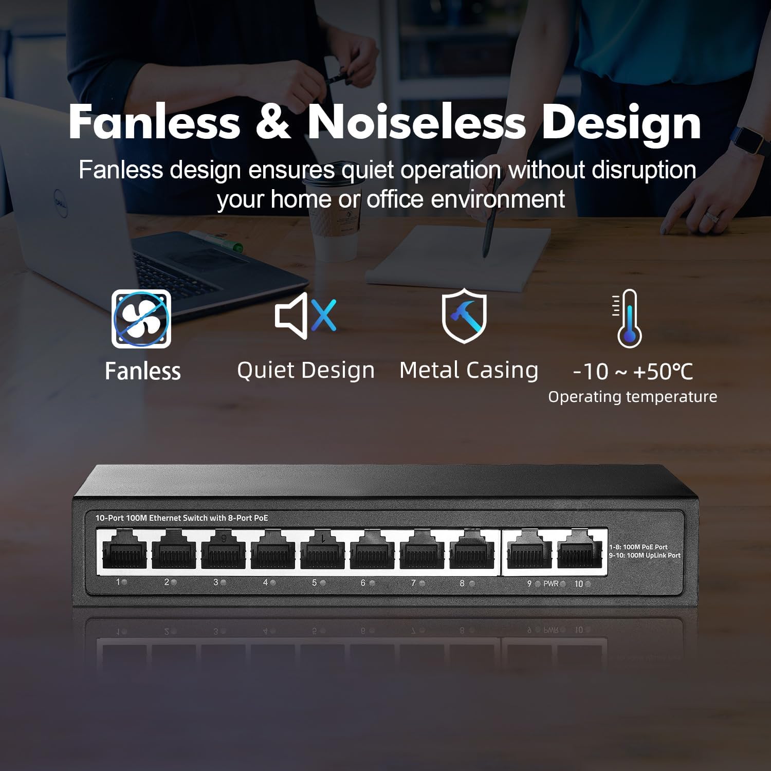 10 Port Mini PoE Switch with 8 PoE+, 2 Uplink, 10/100Mbps Ethernet, 120W 802.3af/at PoE, Fanless Metal Plug & Play PoE+ YuLinca Network Switch