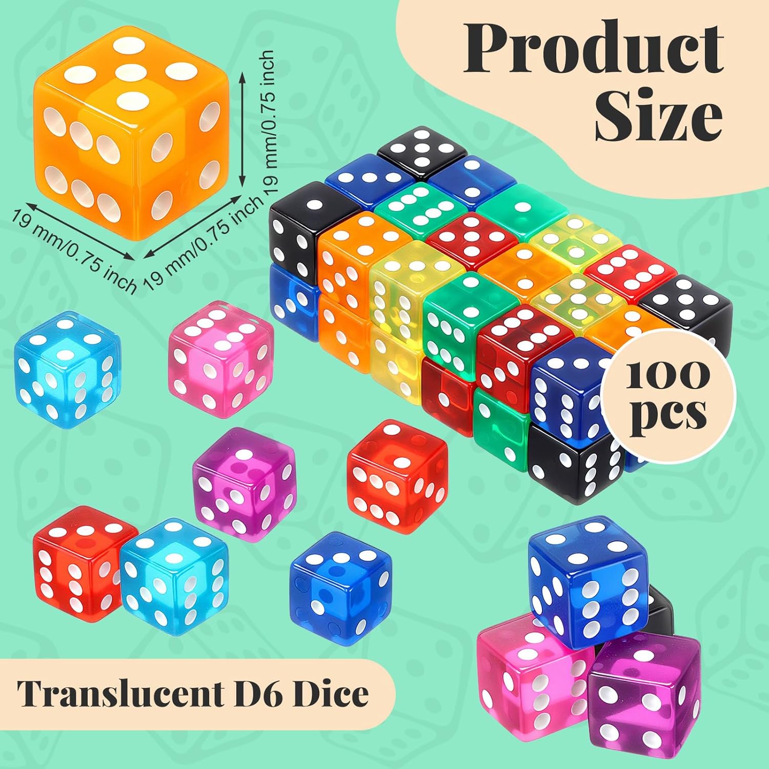 - Comprehensive Gaming Set: elevate your gaming experience with our inclusive package of 100 translucent 19mm polyhedral D6 dice in 10 vibrant colors; With this set, every player is equipped and ready for that crucial role, ensuring seamless gameplay for all