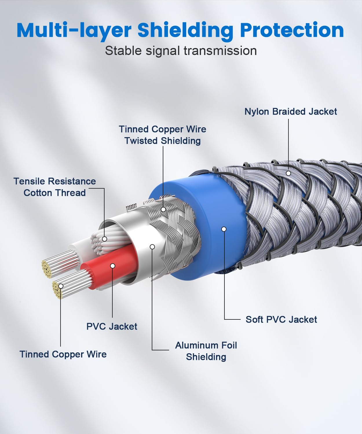 - 【Durable Nylon Braid】The heavy-duty nylon braided jacket provides superior flexibility, tangle-free handling, and abrasion resistance. With a bending lifespan of 10,000+ cycles, this cable withstands rigorous use in both professional and home environments.
