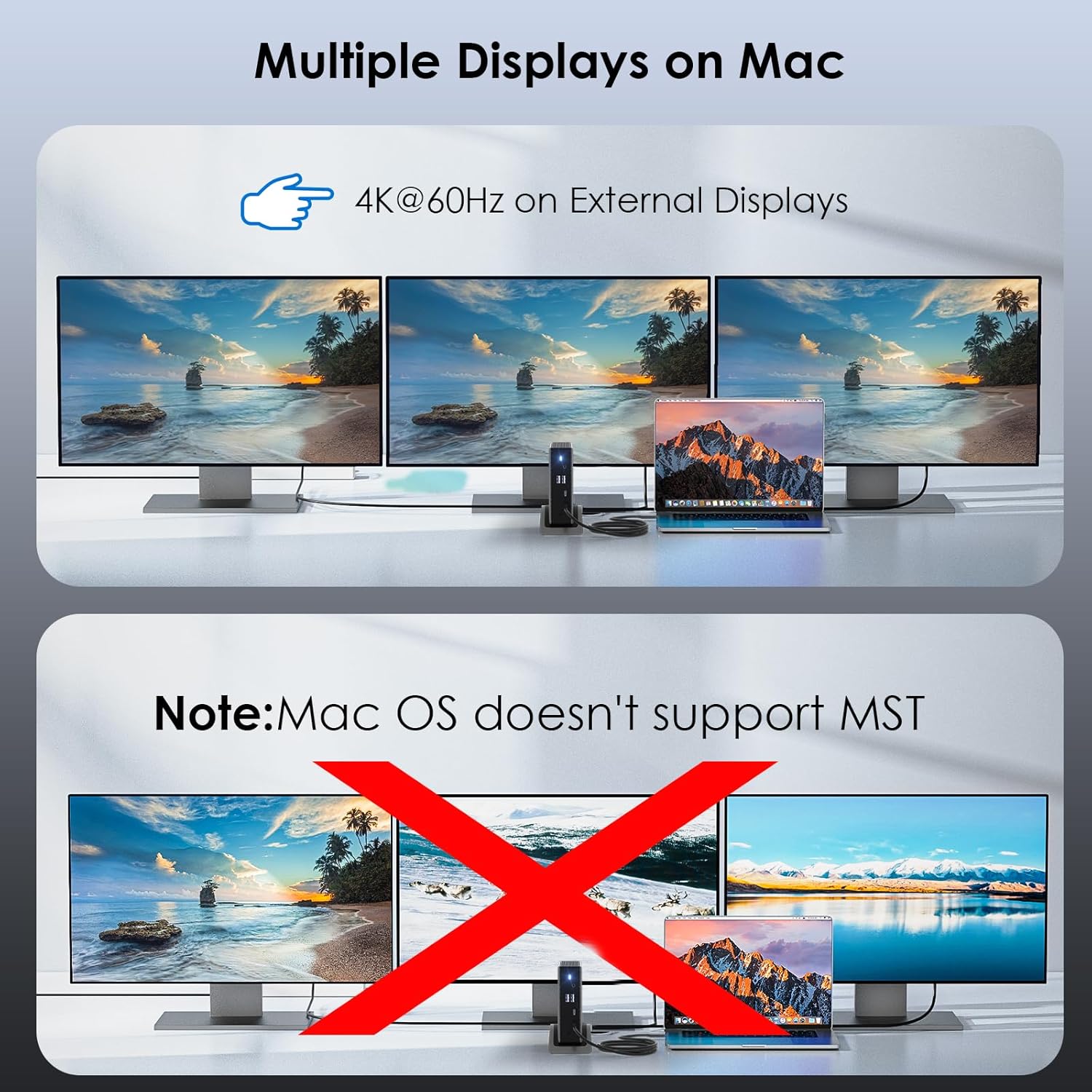 - Triple display or dual monitor: Equipped with dual HDMI and one DisplayPort port, Single can up to 8K@30Hz/4K@144Hz under DP1.4 source. Resolution will be 4K@60Hz if two monitors play simultaneously.Connect up to three monitors simultaneously.it perfect for expanding multiple displays for meetings, presentations, stock chart analysis, programming, and more.(Pls Note: Please make sure that the USB-C port on the laptop host supports video transmission)
