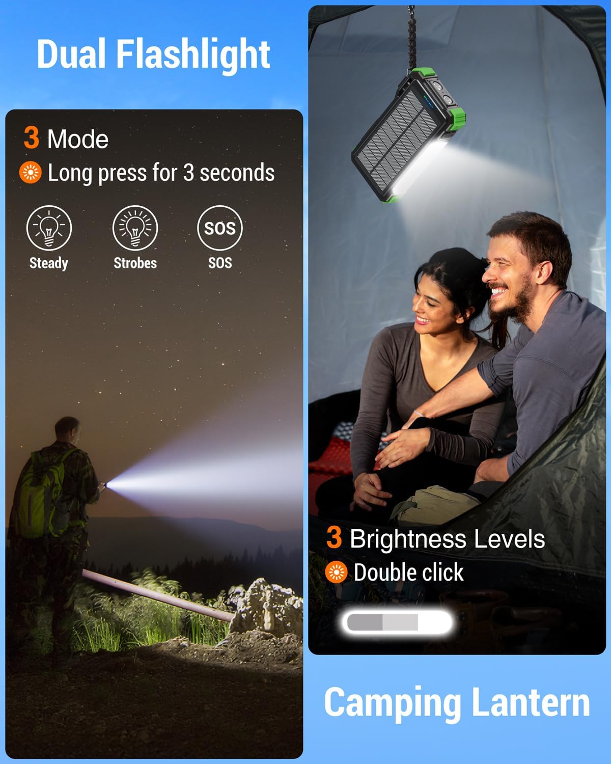 - Durable & Convenient Design for Outdoors: BLAVOR portable solar charger maded from high-strength flame retardant ABS and PC materials, is well made to be waterproof, shockproof, dustproof, which can withstand the harsh environment outdoors. As well equipped with a flashlight featuring 3 different modes, a camping light with 3 adjustable levels, a red indicator light, a compass, a thermometer, a carabiner, and a rope. Whether for daily use or outdoor activities, this portable power bank will be an essential part of your travel kit