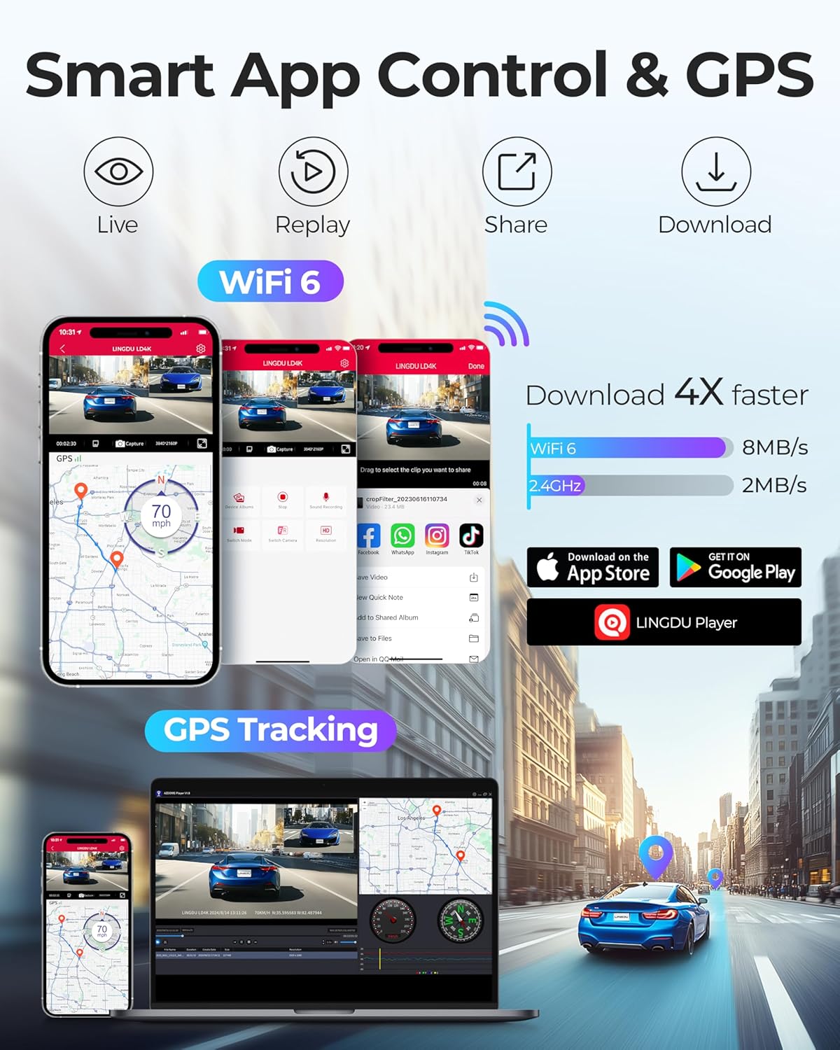 - ăSuperfast 5.8GHz WiFi for Instant Sharingă Enjoy ultra-fast video transfers with upgraded 5.8GHz WiFi. Simply connect your smartphone via the LINGDU app (iOS & Android supported) to preview, download, and share footage on the goâno cables, no delays