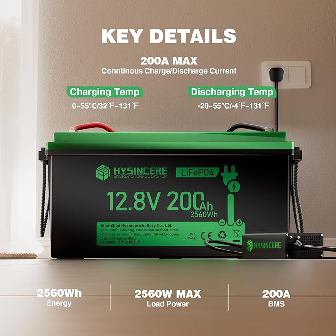 - 【🔋Built in 200A BMS】 HYSINCERE 12V 200Ah LiFePO4 battery built-in 200A BMS with instantaneous discharge current (3S) up to 400A, and provides protection against overcharge, overdischarge, overcurrent, overheating, and short-circuit. Ideal for yachts, ships, pleasure boats, RVs, vans, motorhomes, home backup energy, solar energy storage, off-grid solar power systems, etc...
