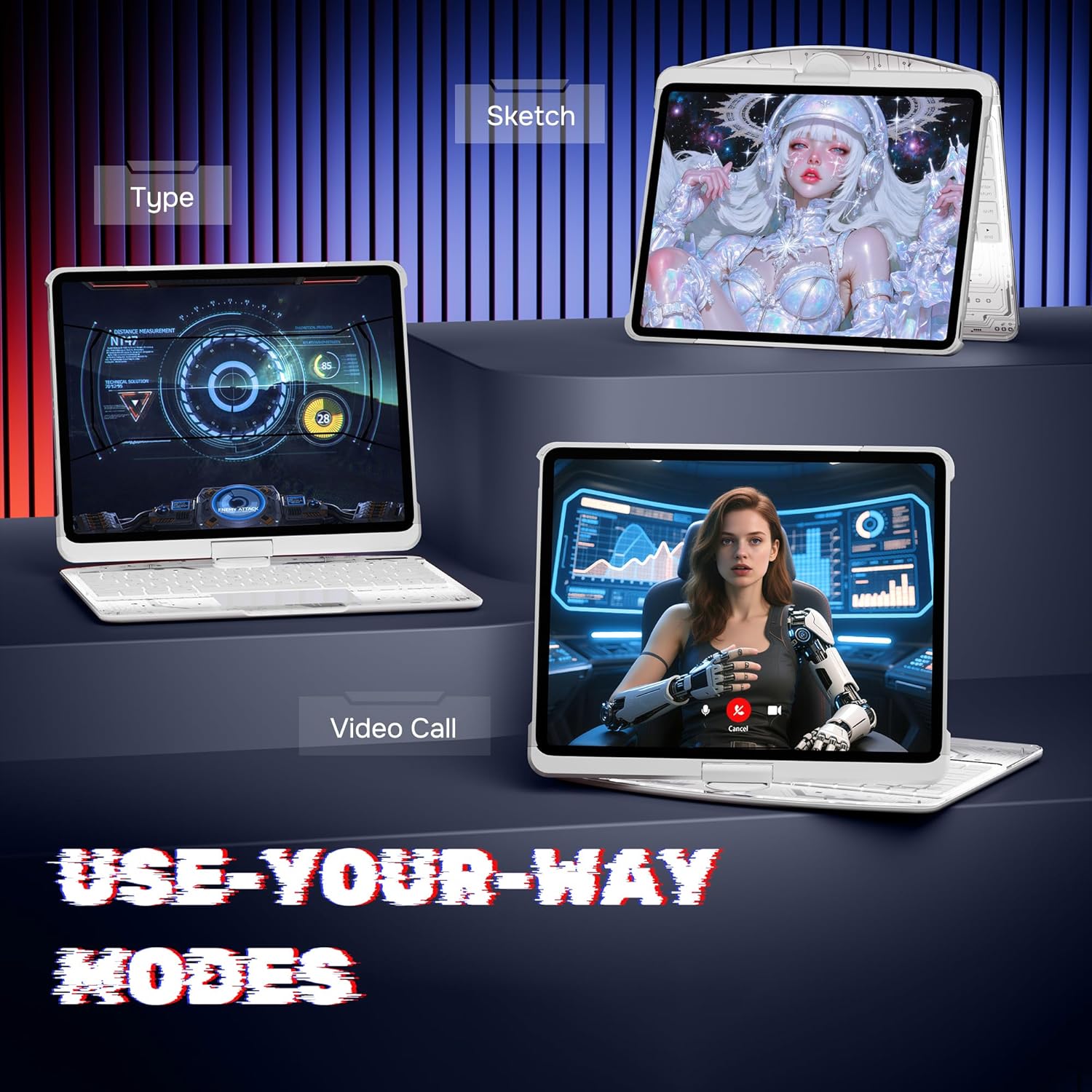 - 360° Rotating Stand & Multiple Viewing Angles: Experience complete flexibility with the 360° swivel base, featuring five adjustable angles. Whether you're typing, drawing, or watching videos, easily adjust your iPad for optimal comfort and efficiency in any position.