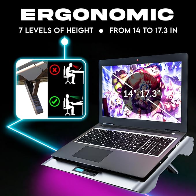 - ⚠️IMPORTANT COMPATIBILITY NOTE. Designed for laptops from 14" to 17.3" with bottom ventilation. Not suitable for smaller laptops or MacBooks without underside vents. Reach out via “Contact Seller” if unsure about fit.