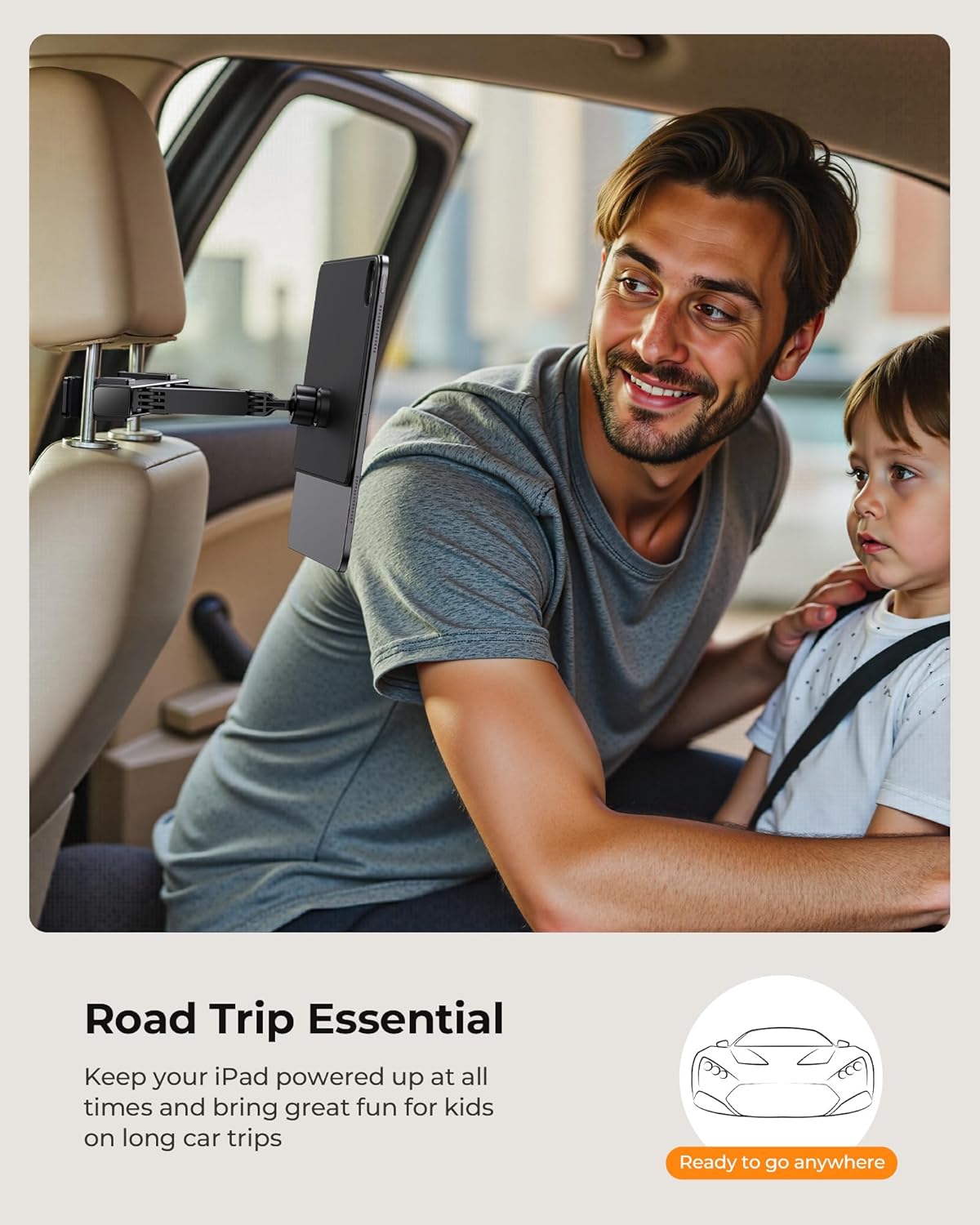 - Tool-Free Setup & 360° Safe Viewing: Get your iPad mounted securely in seconds—no tools needed! The magnetic base attaches instantly, while the 360° rotating ball head lets you easily adjust the perfect viewing angle. Designed especially for kids, it helps prevent neck strain during long trips by holding the tablet at eye level. A must-have family-friendly car accessory!"