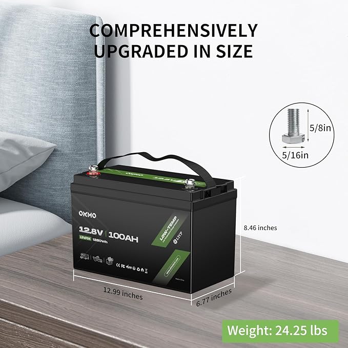 - Note: The OKMO 100Ah LiFePO4 battery is recommended for use with trolling motors with a thrust of 30-100 lbs. It is not suitable for use as a starter battery or for golf carts