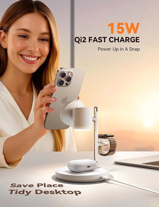 - Multi-Functional Phone Stand: Effortlessly power your iPhone (with Qi2/MagSafe), AirPods, and Apple Watch.JOYROOM charging station powerful magnets ensure perfect alignmentājust place your device and it snaps securely into place. Lift off easily when charged, supported by a sturdy, non-slip base that stays firmly planted. Adjust the MagSafe charger up to 45° for perfect viewing or use it as a phone stand,, seamlessly switch between landscape and portrait modes for optimal viewing comfort while maintaining a reliable charge. Itās the sleek solution for powered devices and a clutter-free desk