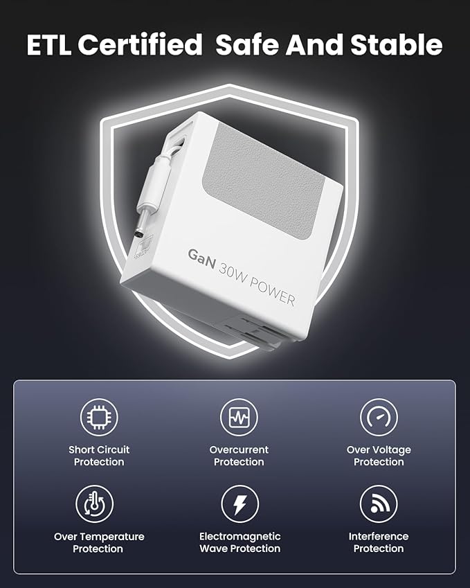 - 30W Fast Charging: Power devices 3x faster with our space-saving retractable charger, Intelligent power optimization ensures safe, efficient charging while global voltage compatibility (100-240V) works flawlessly worldwide. 3-Smart Mode Selector (5V/2.5A / 9V/2.5A / 12V/2.5A) prevents device damage by matching exact power needs.