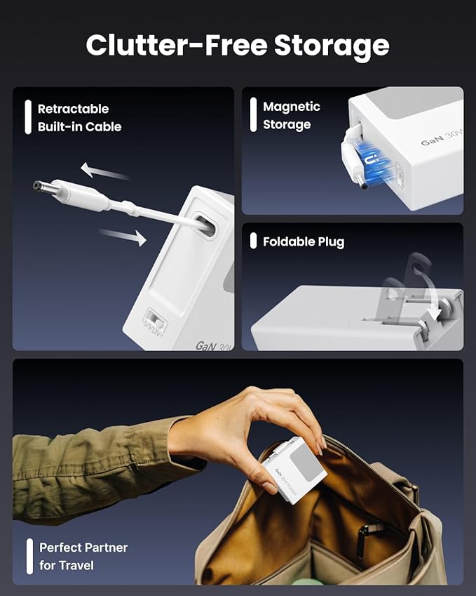 - Retractable 31.5in DC Power Cord: The wall charger features a built-in retractable DC power cord that extends to a length of 31.5 inches and adjusts in 10 levels to meet different length requirements. Its built-in retractable mechanism allows the cable to retract freely in one second, ensuring a tidy space at home, in the office, or while traveling. Note: After pulling out the cable, gently stretch it another 1 cm to retract it.