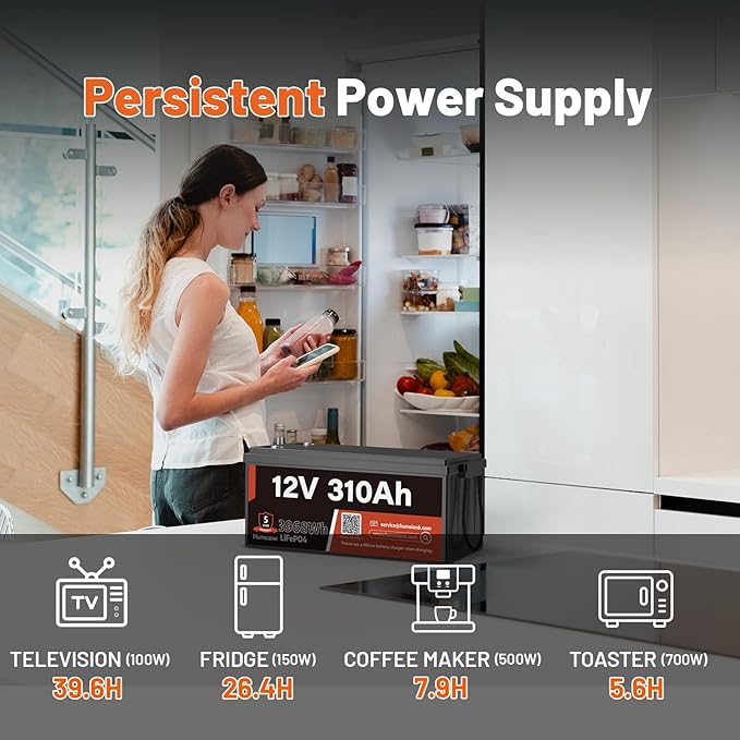 - 15,000+ Deep Cycles & 10-Year Lifespan – This 12V 310Ah LiFePO4 battery delivers 3968Wh energy with 100% Depth of Discharge (DOD), lasting 30x longer than lead-acid batteries. Perfect for solar storage, RVs, and off-grid setups.