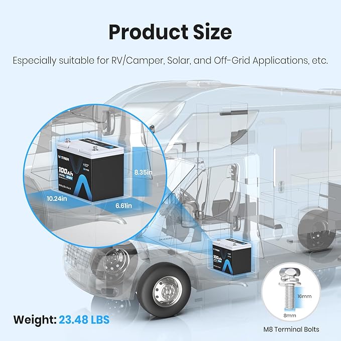 - 【Group 24 Battery Size 】The 12V 100Ah lithium battery has dimensions of 10.24 x 6.61 x 8.35 inches and weighs 23.48 lbs, making it an ideal fit for a Group 24 battery compartment. With a 12V 100Ah capacity, this Group 24 lithium battery offers consistent, high-performance energy delivery. It outlasts traditional lead-acid batteries, providing up to 5000+ deep cycles and reducing the need for frequent replacements.