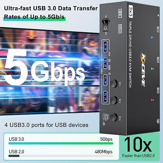 - 【HDMI Displayport KVM Switch with 4 USB 3.0 Port 】 Triple monitor KVM switches with 4 integrated USB 3.0 ports,supports ultra-fast 5Gbps data transmission,which can recognize keyboard, mouse, printer, scaner, USB flash drive and other USB devices.