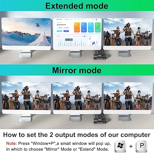 - 【 KVM Switch 3 Monitors 3 Computers 】 This 3 computers 3 monitors KVM switch perfect for hooking up 3 desktops /laptops to share one set of wired or wireless keyboard mouse and 3 monitors (supports extended and mirrored display modes). Please note: extended mode can output three different screens and mirror mode can output three identical screens.