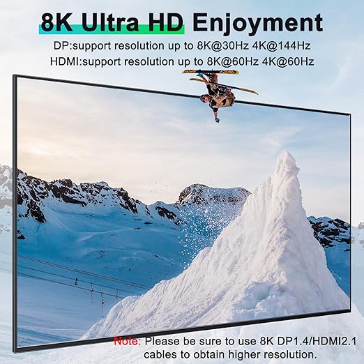 - 【KVM Switch Triple Monitor Ultra HD 8K】 3 Monitors KVM Switch Displayport: support resolution up to 8K@30Hz /4K@144Hz, HDMI: support resolution up to 8K@60Hz/4K@120Hz and backward compatible with lower resolution.Note: Final resolution is also subject to graphic cards, monitors, cables and adapters.