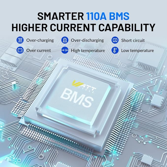 - Advanced 100A BMS Protection: The built-in 100A BMS safeguards 12V 100Ah LiFePO4 Pro battery cells against overcharge, deep discharge, overload, overheating, low temperatures, and short circuits. It monitors battery status, manages charging and discharging, and ensures battery efficiency through individual battery balancing.