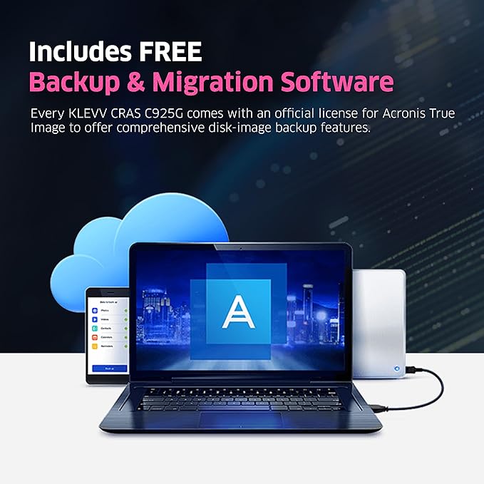 - Includes FREE Backup & Migration Software: Every KLEVV CRAS C925G SSD comes with an official license for Acronis True Image. The software offers comprehensive disk-image backup features, enabling users to effortlessly restore or transfer data from their existing drive.